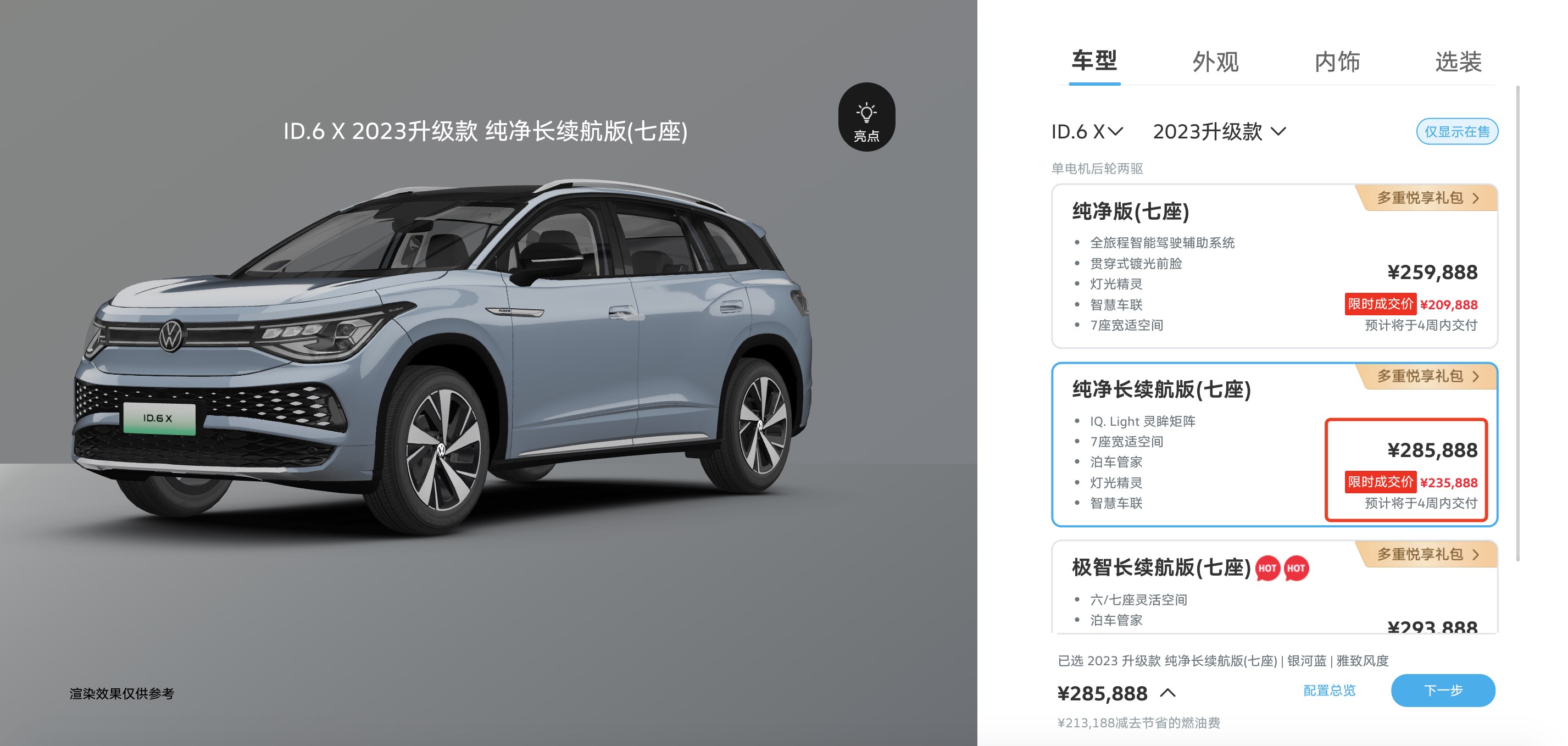 動(dòng)力續(xù)航上,ID.6 X提供多種性能、續(xù)航版本,主銷車型配備寧德時(shí)代三元鋰電池,容量為83.4千瓦時(shí),支持0.67小時(shí)快充,最高續(xù)航617公里。同樣,作為ID.家族旗艦級(jí)SUV,上汽大眾為ID.6 X推出限時(shí)優(yōu)惠,綜合優(yōu)惠至高5萬元。從官網(wǎng)顯示,ID.6 X長(zhǎng)續(xù)航版指導(dǎo)價(jià)28.5888萬元,限時(shí)優(yōu)惠價(jià)格23.5888萬元,25萬元落地一款6座純電中大型SUV,是不是很誘人?